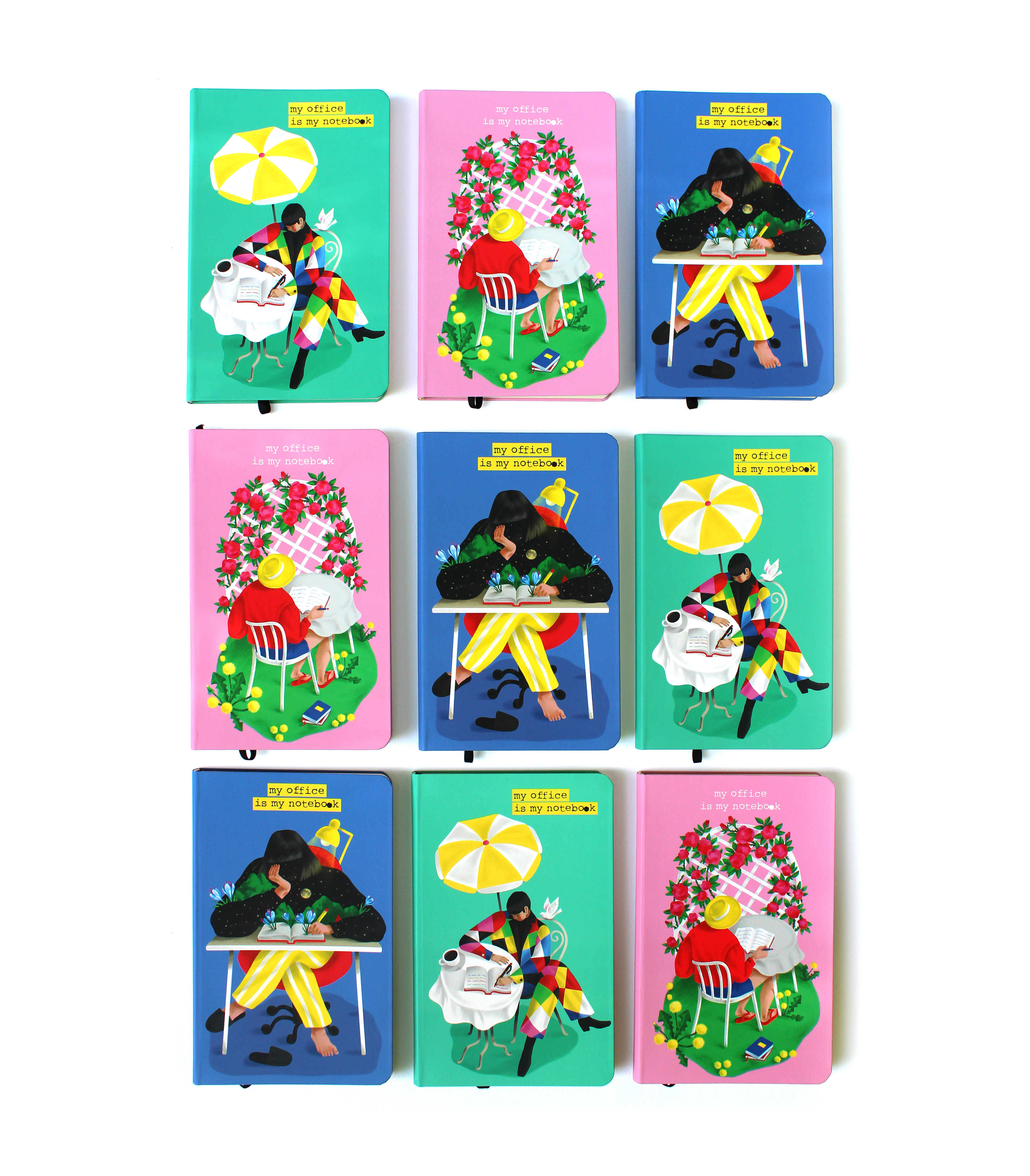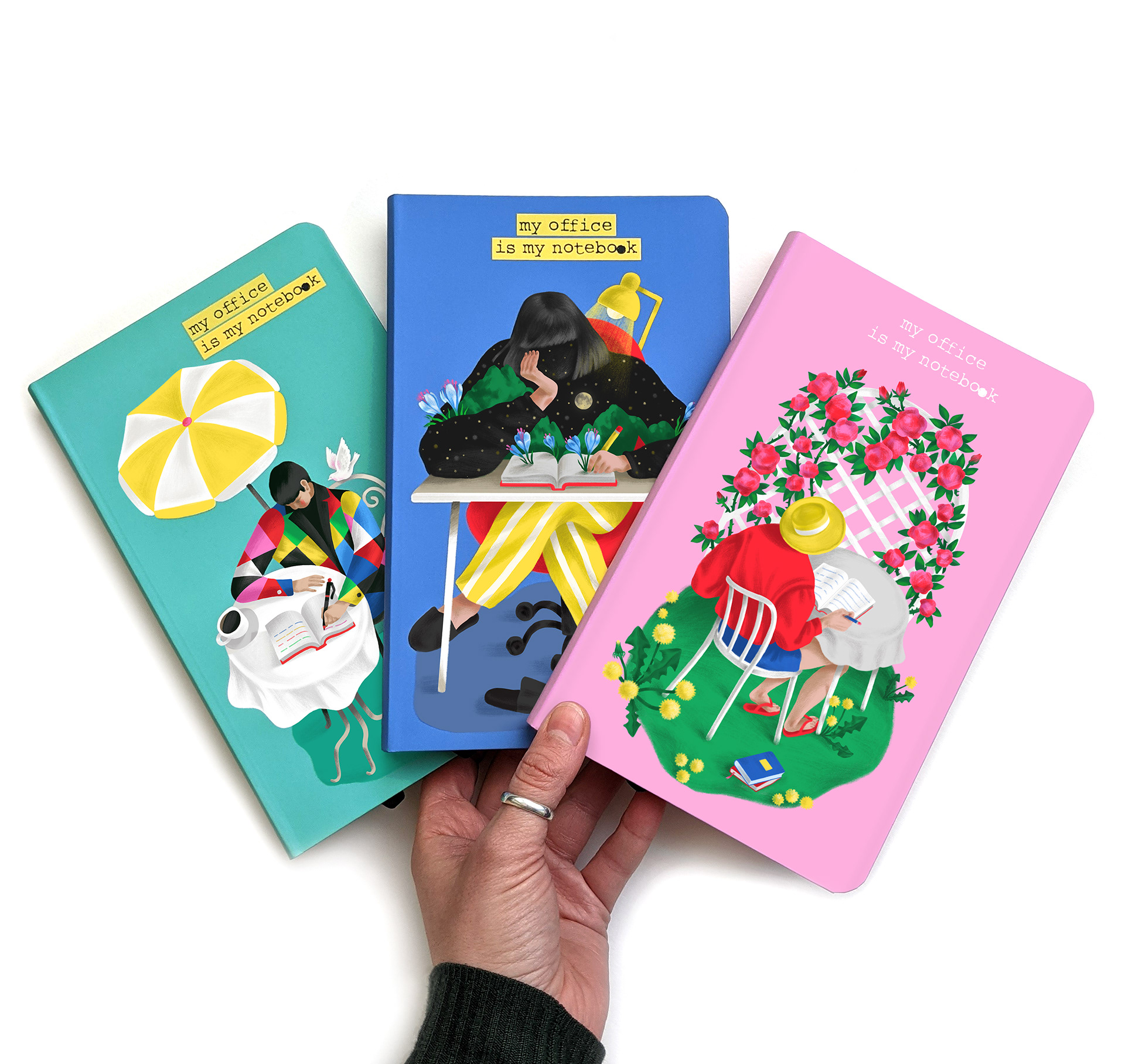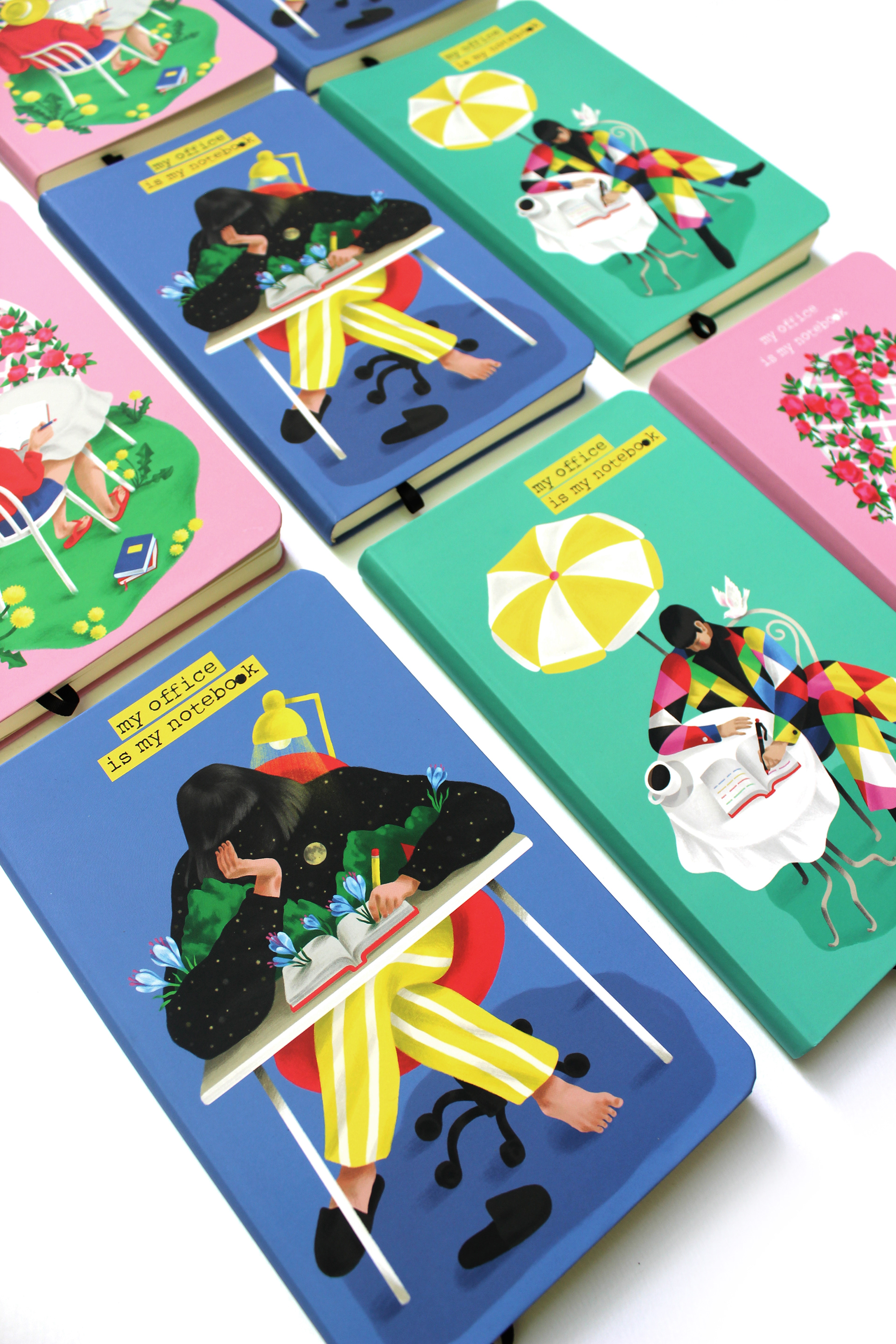Illustrations for the covers of the notebook collection ''My office is my notebook'', produced by Rod Cărturești. This project was inspired by the pandemic and how it changed our lives in the past year, pushing us to rethink our workspace.
