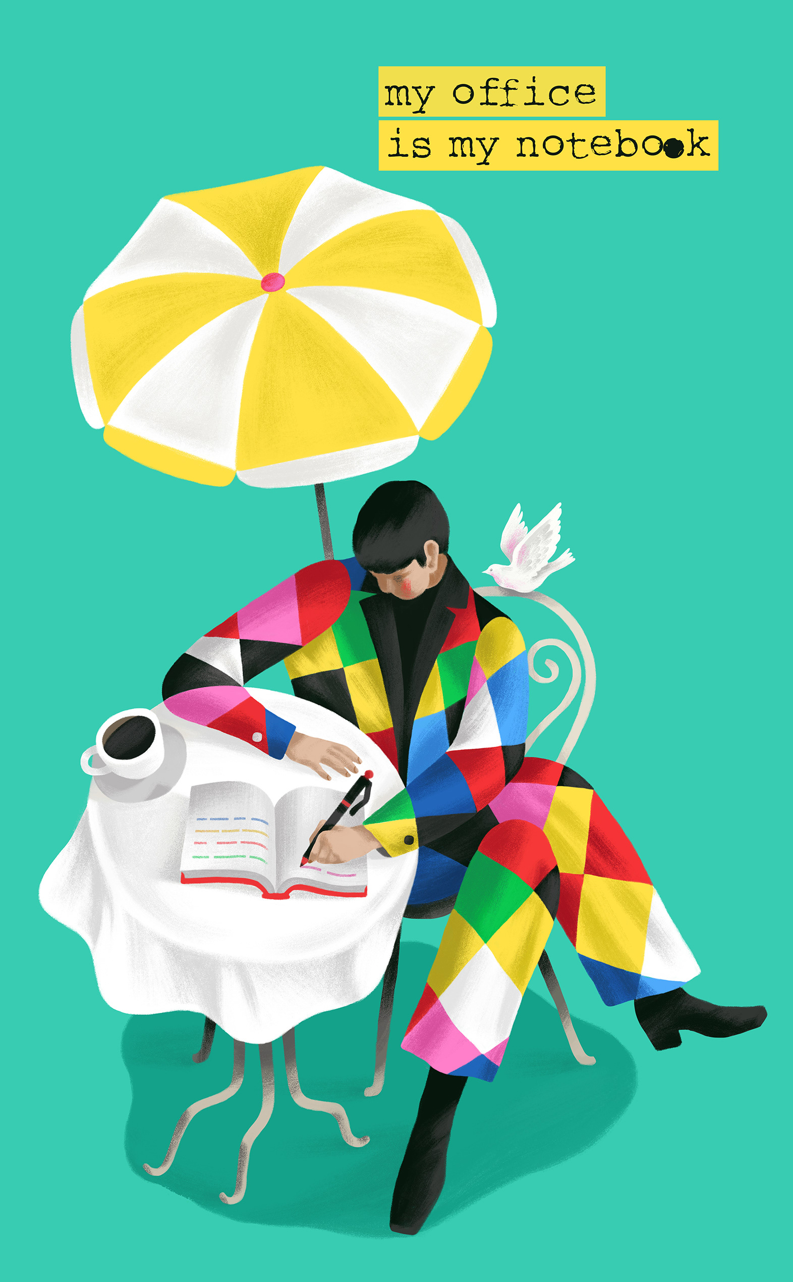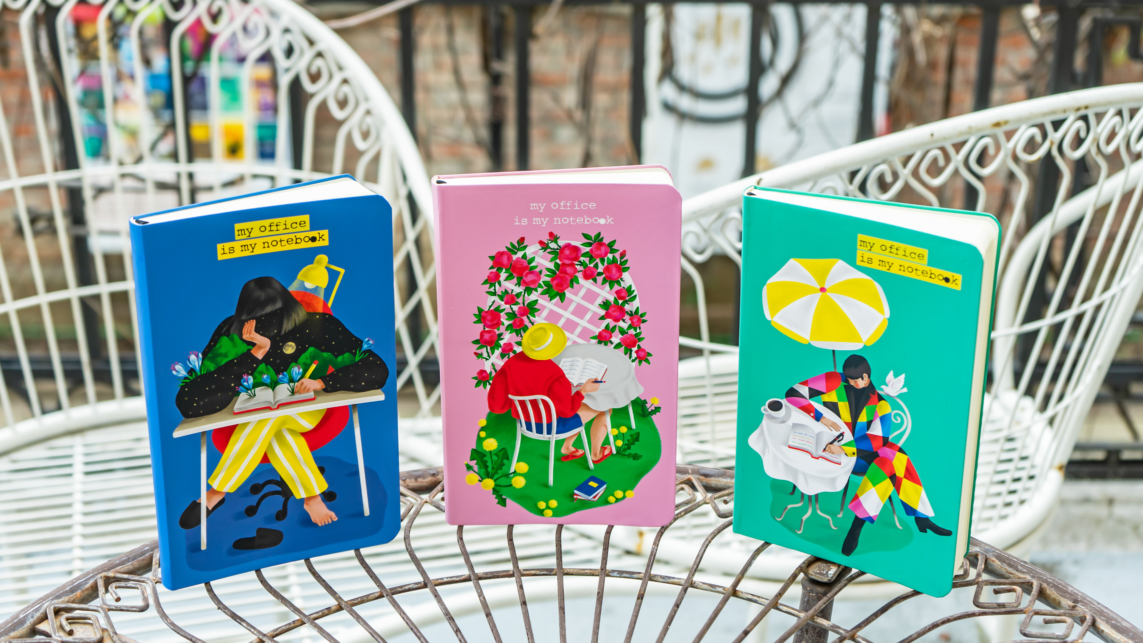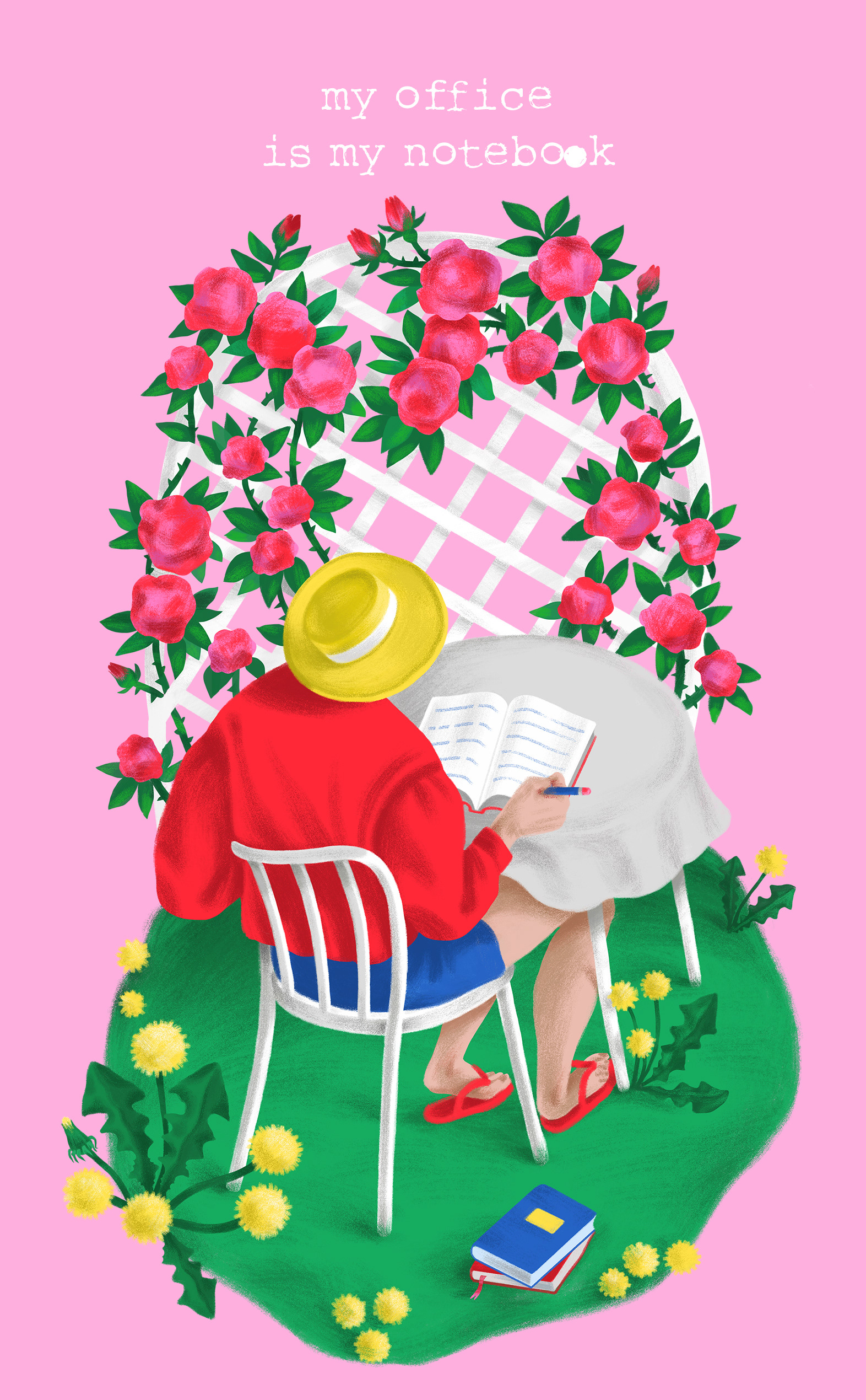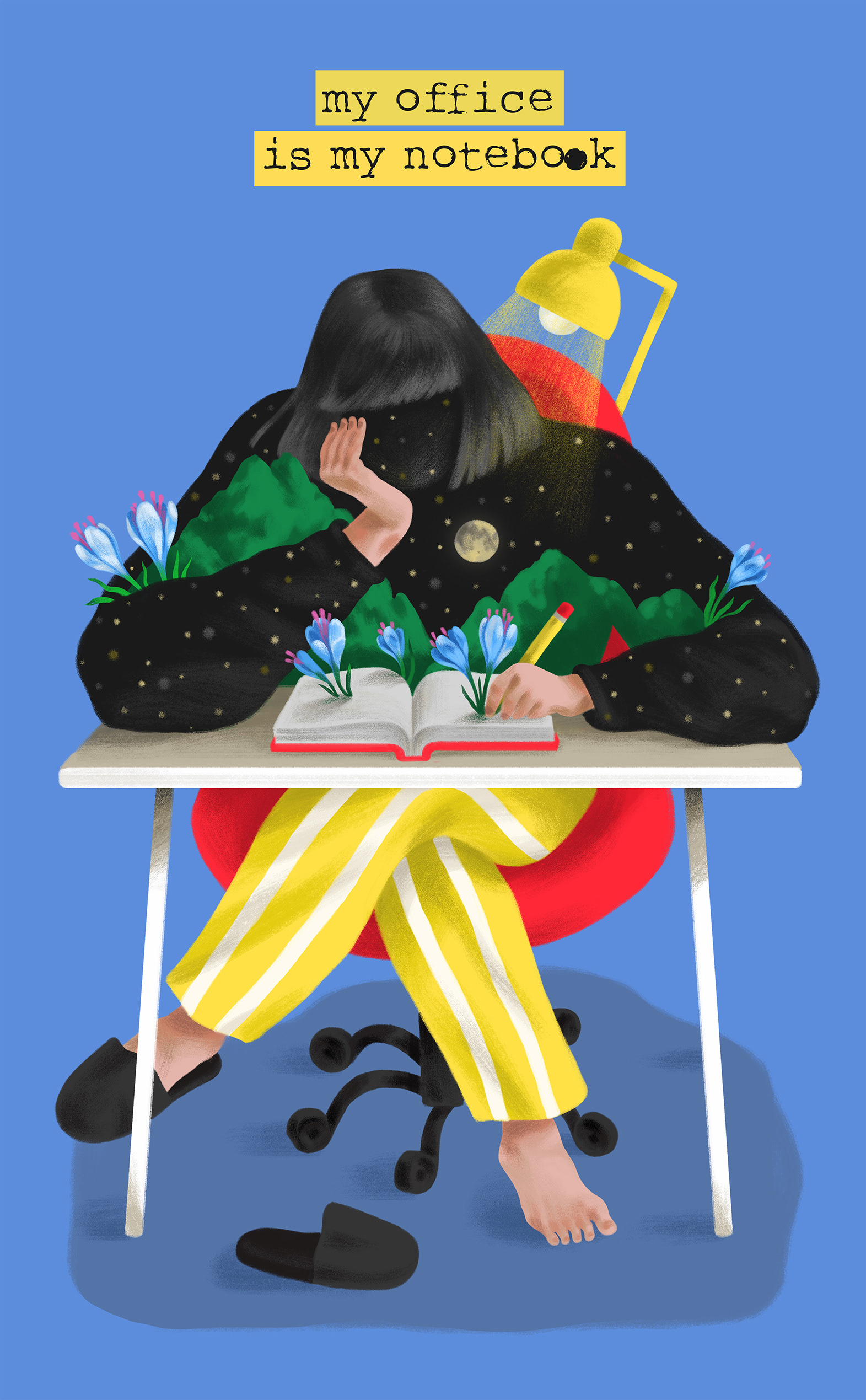 Illustrations for the covers of the notebook collection ''My office is my notebook'', produced by Rod Cărturești. This project was inspired by the pandemic and how it changed our lives in the past year, pushing us to rethink our workspace.